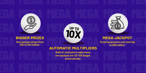 MEGA MILLIONS is now even more MEGA with exciting updates that make every play feel even bigger. Each ticket packs more possibilities: like automatic multipliers added to every play and chances to win even bigger non-jackpot prizes.