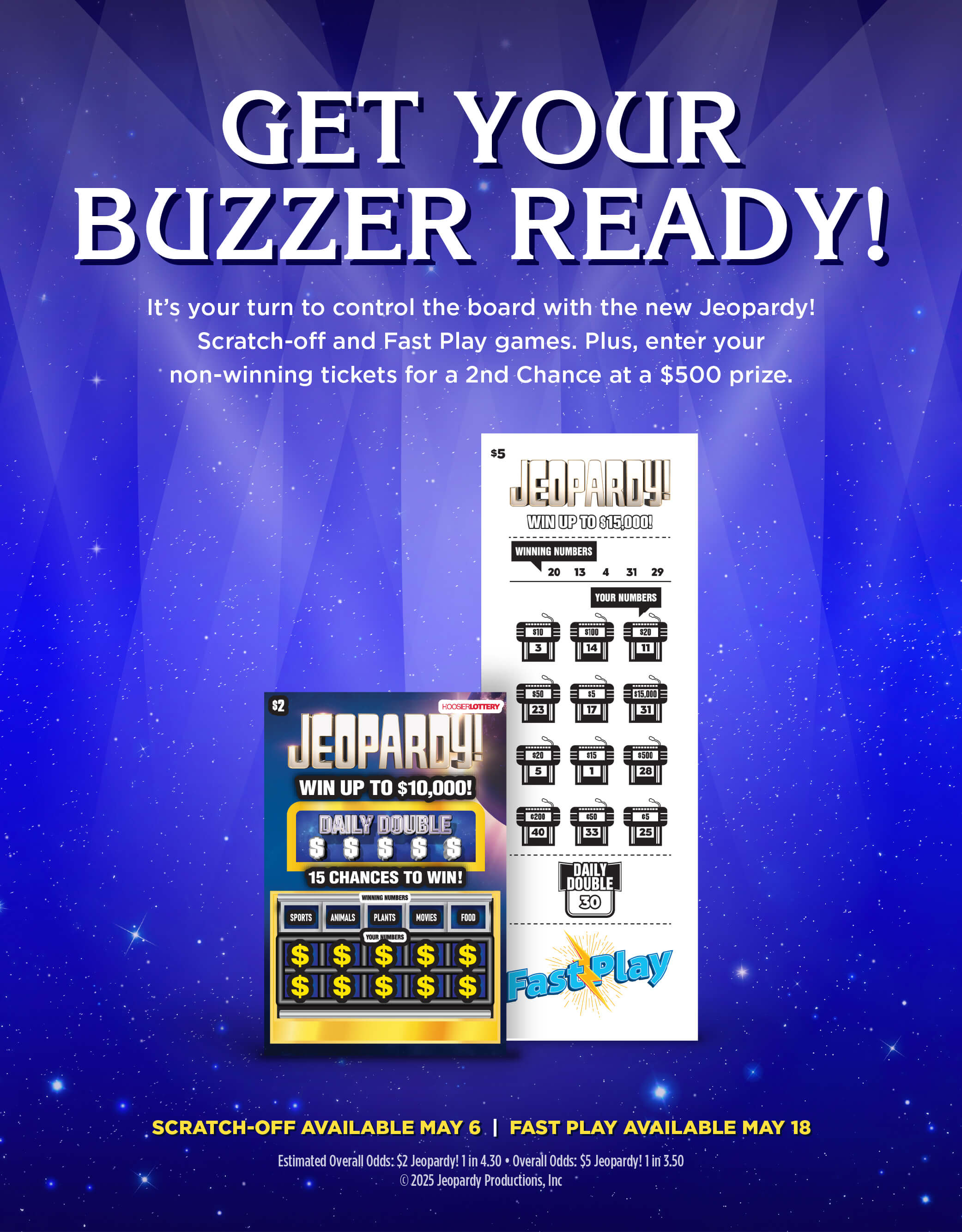 Get your buzzer ready! It's your turn to control the board with the new Jeopardy Scratch-off and Fast play games. Plus, enter non-winning tickets for a 2nd chance at a $500 prize. Scratch off available may 6, Fast play available may 18