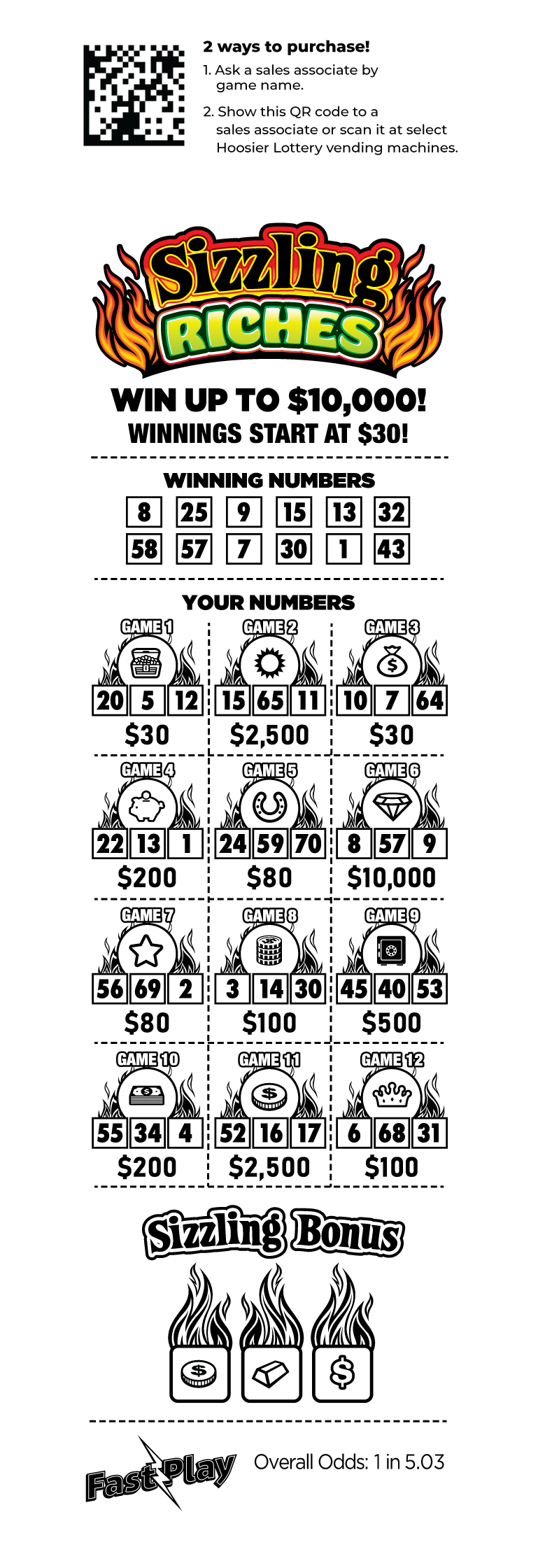 Ask a sales associate for a Sizzling Riches Fast Play ticket by game name or purchase from select Hoosier Lottery vending machines.