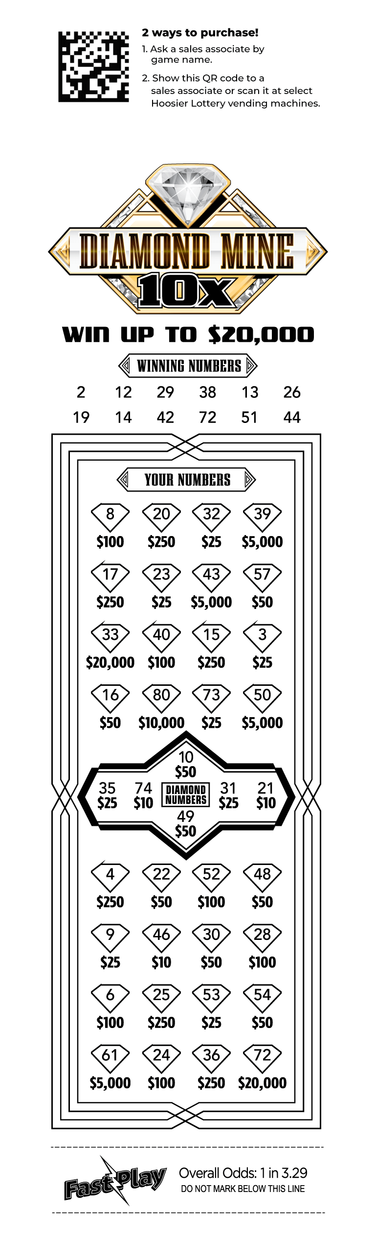 Join NowAsk a sales associate for a Diamond Mine 10X Fast Play ticket by name or purchase from a Hoosier Lottery vending machine.