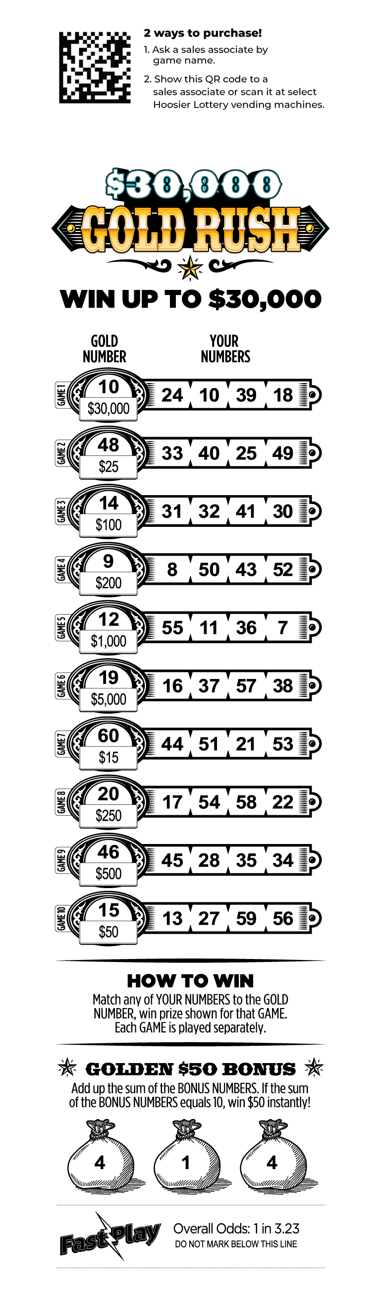 Ask a sales associate for a $30,000 Gold Rush Fast Play ticket by name or purchase from a Hoosier Lottery vending machine.