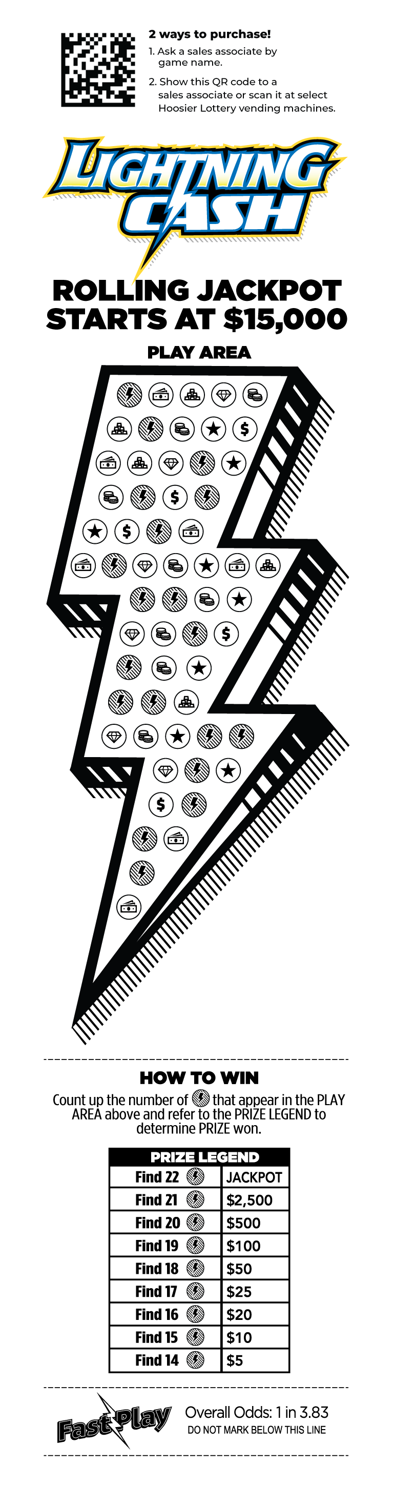 Ask a sales associate for a Lightning Cash Fast Play ticket by game name or purchase from select Hoosier Lottery vending machines.