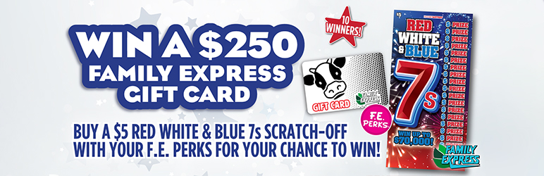 What: F.E. Perks members who purchase a $5 Red, White, & Blue 7s Scratch-off will be entered to win one of ten prizes. Self-Service sales excluded. Drawing conducted and prizes awarded by Family Express. Ten prizes awarded from entries from all stores.