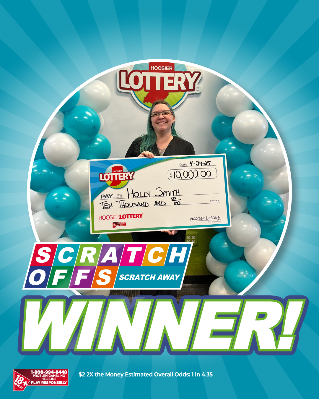 Holly Smith, a resident of Scottsburg and a pharmacy technician, likes to add a little fun to her day by playing Hoosier Lottery Scratch-offs every now and then. While she was shopping at Walmart, Holly picked up a $2 2X the Money and started scratching it as she and her husband walked to their car. Suddenly, she turned to him, eyes wide, and said, “Am I reading this right? I just won $1,000!”