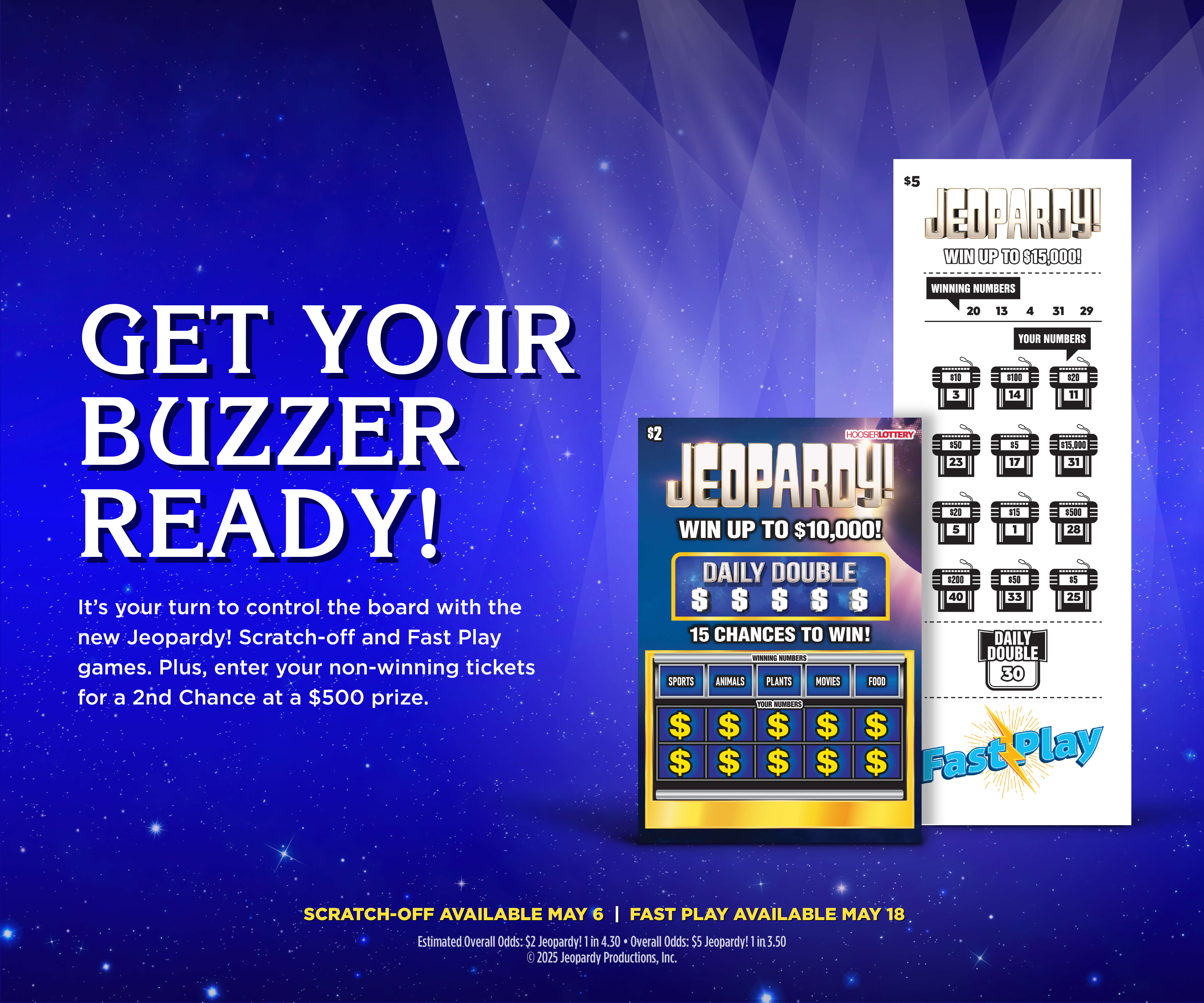 Get your buzzer ready! It's your turn to control the board with the new Jeopardy Scratch-off and Fast play games. Plus, enter non-winning tickets for a 2nd chance at a $500 prize. Scratch off available may 6, Fast play available may 18